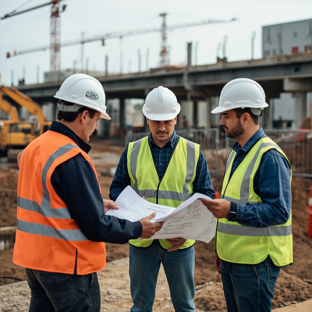 A professional image showing engineers reviewing site plans at an active construction site with machinery and infrastructure development in the background.
